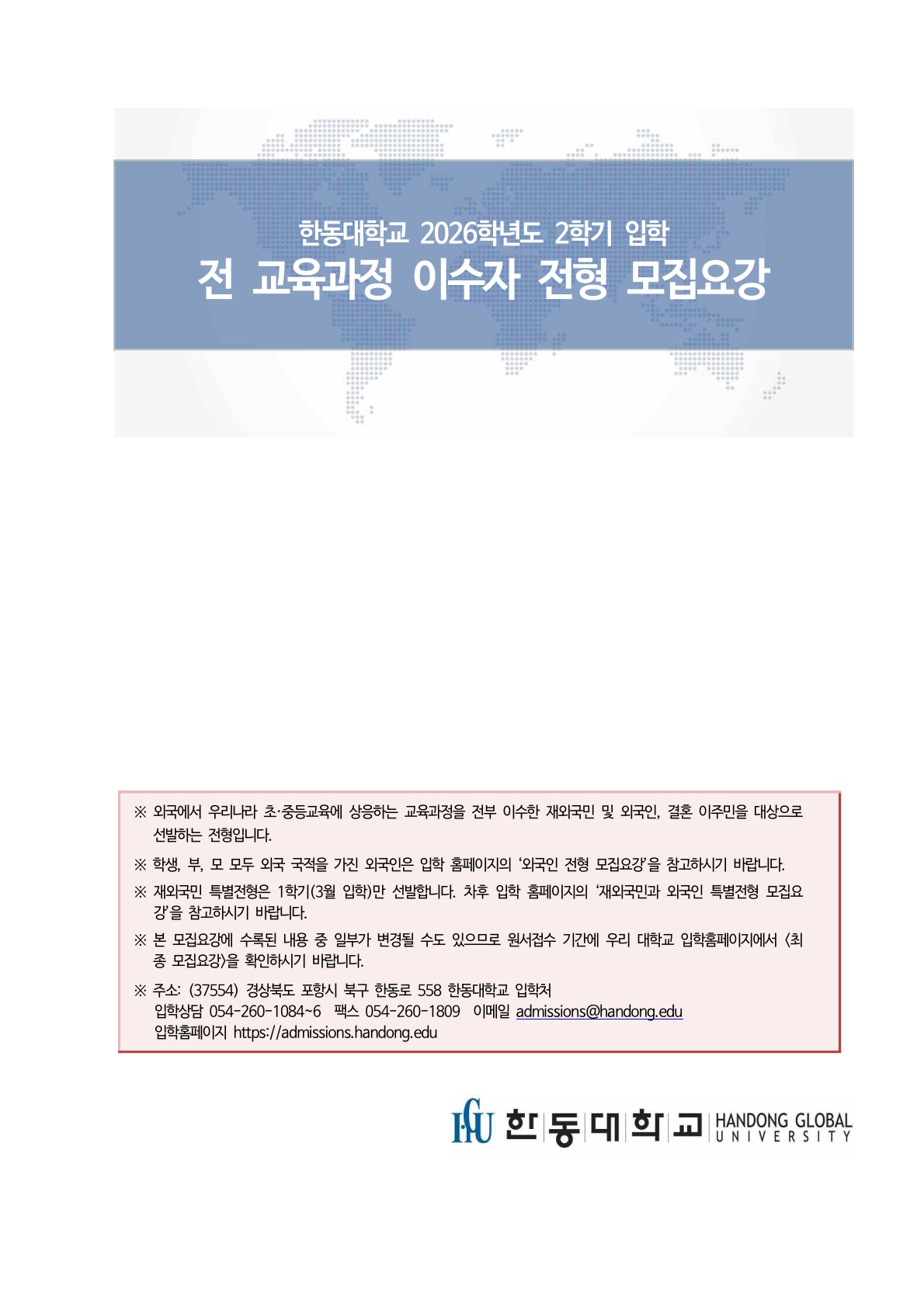 2026학년도 2학기 한동대학교 전 교육과정 이수자 모집요강을 아래와 같이 공고합니다.