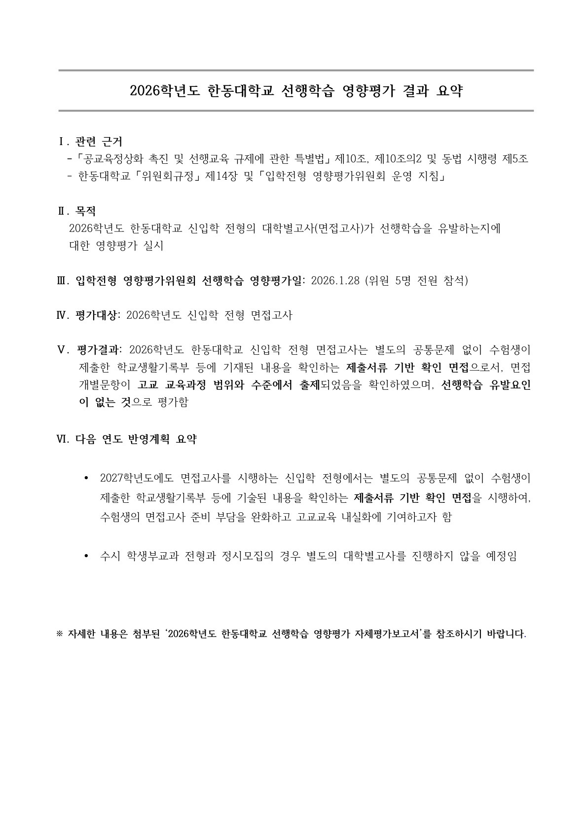 2. 위 관련 근거에 따라 2026학년도 한동대학교 신입학전형 면접고사가 선행학습을 유발하는지에 대한 영향평가를 실시하고, 그 결과를 아래와 같이 공고합니다.